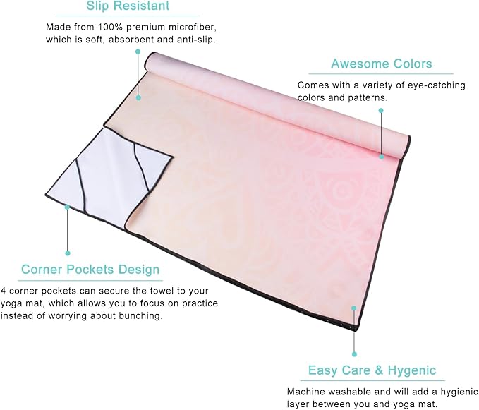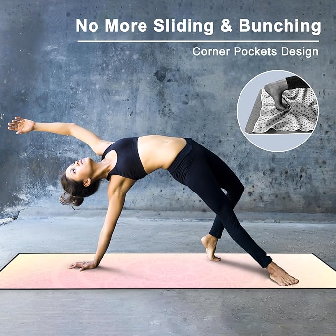 • Corner Pockets Design: Features 4 corner pockets on the backside, the non slip yoga mat towel helps secure and hold onto the mat firmly. This allows you to focus your mind, body and breath on the yoga practice, without worrying about bunching.