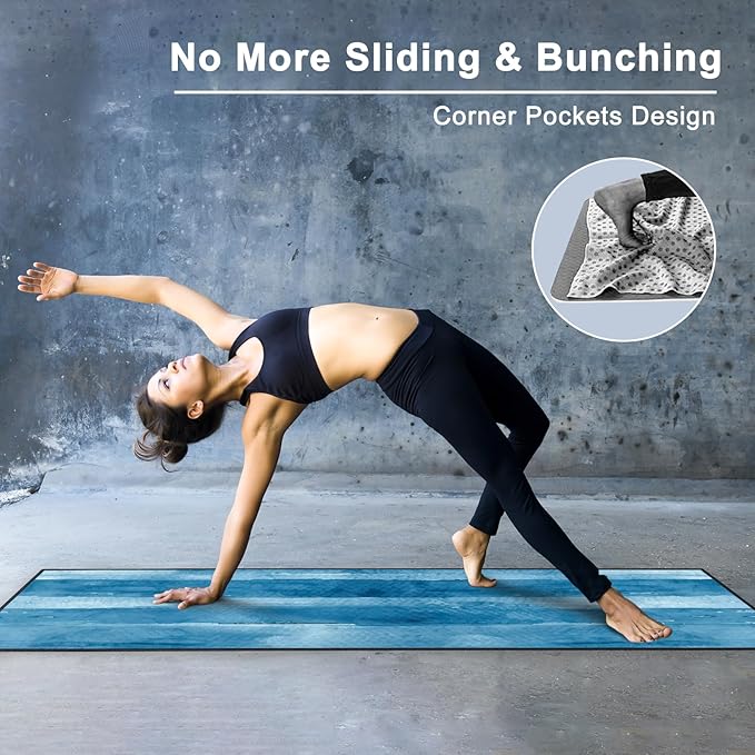 • Corner Pockets Design: Features 4 corner pockets on the backside, the non slip yoga mat towel helps secure and hold onto the mat firmly. This allows you to focus your mind, body and breath on the yoga practice, without worrying about bunching.