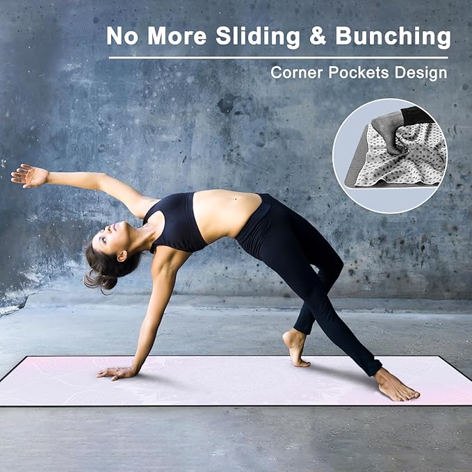 • Corner Pockets Design: Features 4 corner pockets on the backside, the non slip yoga mat towel helps secure and hold onto the mat firmly. This allows you to focus your mind, body and breath on the yoga practice, without worrying about bunching.