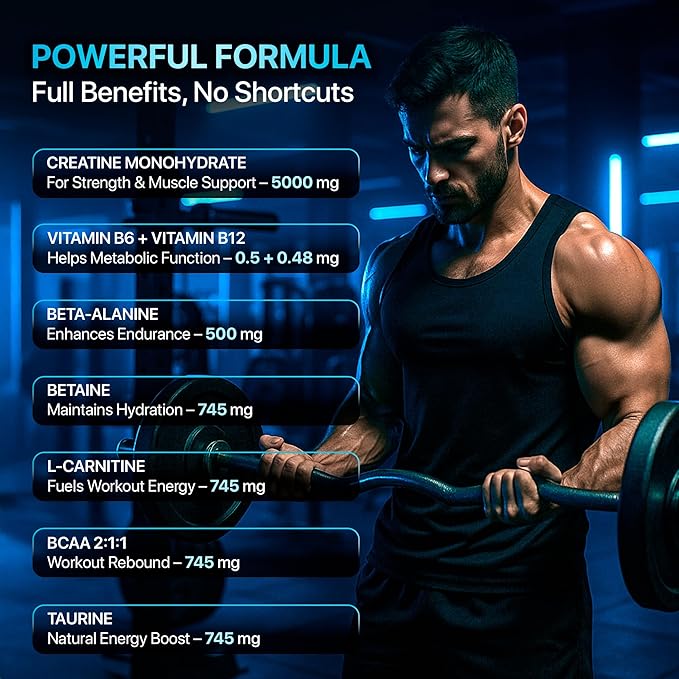 • High Dose Strength: 8500mg complex with 5000mg creatine monohydrate plus L-Carnitine, BCAA, Taurine, and B12 – a powerful pre workout and recovery boost, and a clean alternative to messy powders and low-dose capsules.