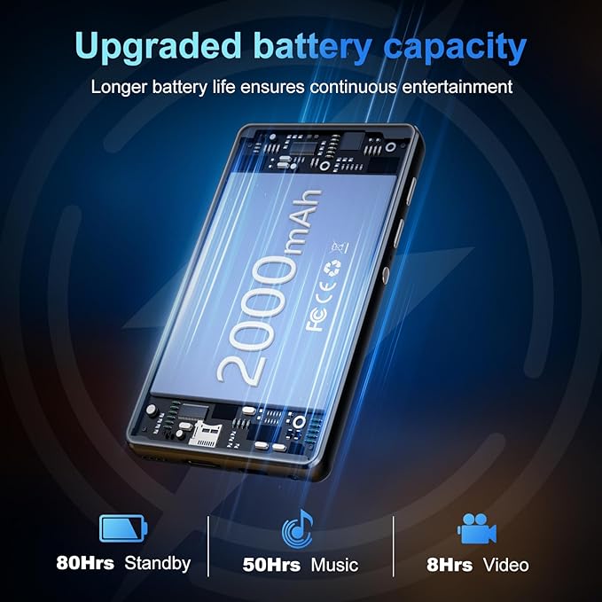 • 【Large Capacity Battery】Our MP3 Wifi player has a built-in 2000mAh lithium battery, support USB charging. It adopts a low-power design and can continuously play music for 45-50 hours or videos for 6-8 hours. It is not only an MP3 player, but also your soul partner when traveling, exercising, driving, and sleeping.