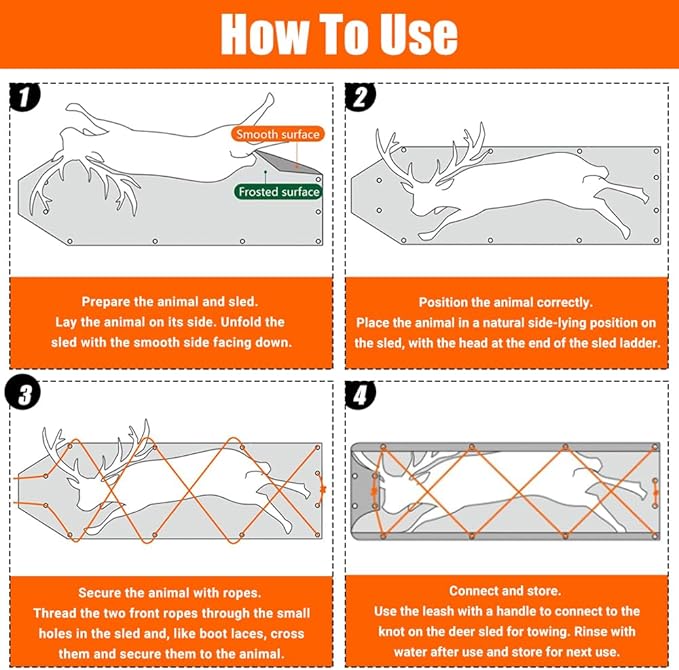 • Easy to Clean & Durable: After each use, simply wash with water or shake off dust and debris and roll up for easy storage. The thickened hunting equipment sled and rope combination makes transporting easier, making it ideal for hauling game over a variety of terrains, including grass, roots, sand, mud, snow, and ice.