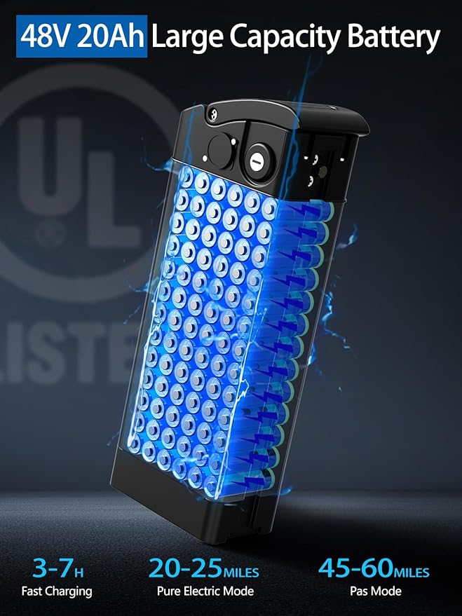 • Certified Lithium Battery: The 48 V 20 Ah, removable battery of our adult foldable e-bike is UL 2849 certified. This foldable electric bikes for adults can travel up to 30 miles in electric-only mode and 60 miles in PAS mode