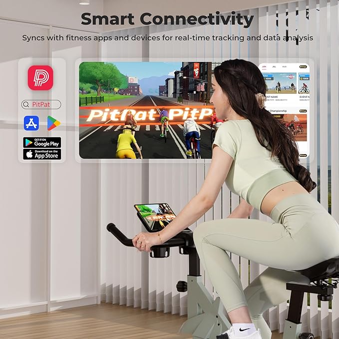 • 【Smart PitPat App Connectivity】Workout bike can Sync with the PitPat app to access personalized training plans, real-time progress tracking, and free professional courses. Stay motivated and transform your home workouts into engaging, goal-driven sessions
