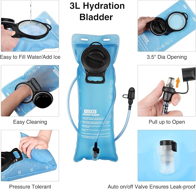 • 3-Liter TPU Water Bladder – Includes a large-capacity 3L hydration bladder made of TPU, not any BPA material. The wide screw cap makes filling with water, ice cubes, or sports drinks fast and easy, while the leak-proof bite valve ensures smooth water flow without spills. Good for keeping you hydrated during long outdoor sessions without constantly stopping to refill.