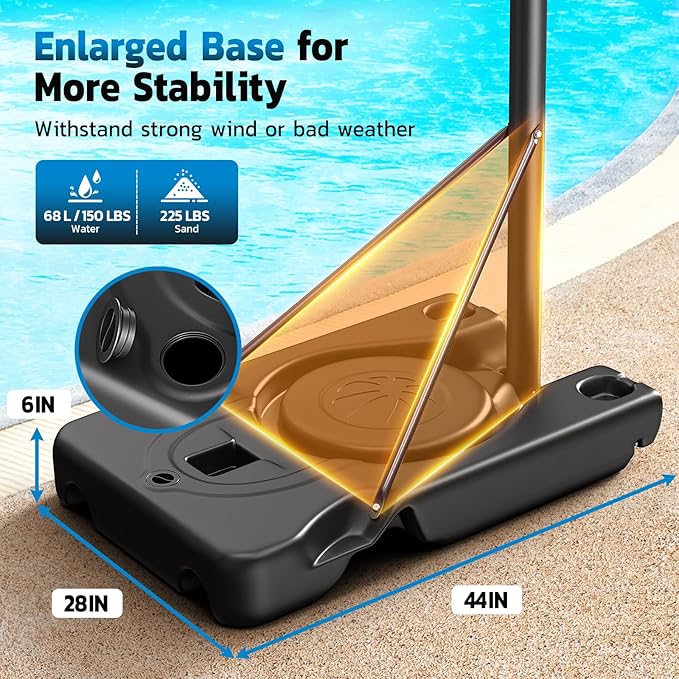 • Heavy-Duty Base Tank: Basketball goal with 20% bigger base - holds up to 68L/150LBS of water or 225LBS of sand. The extra size and weight dramatically boost stability, safety, and long-term performance of the basketball goal.