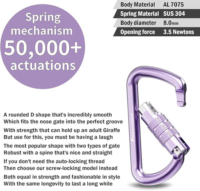 • 【SAFE TO USE】- With the auto lock, you don’t need to worry you would lose your keys or belonging; it’s a very strong carabiner (12kN/2698lbs), and you don’t need to worry about hanging a heavy hammock chair or other heavy stuff