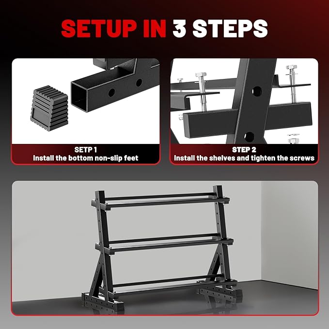 • Setup in 3 Steps: Our 3-tier dumbbell rack has been improved, simply attach the non-slip rubber feet and place the shelves onto the frame. No complex tools or lengthy setup required. Enjoy immediate, space-saving storage with enhanced stability and floor protection.