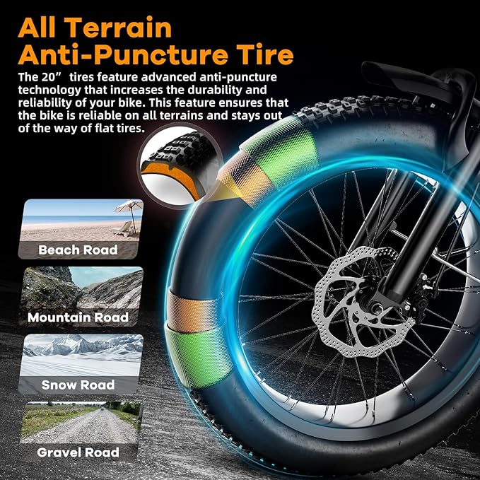 • 𝐒𝐚𝐟𝐞 𝐀𝐧𝐝 𝐂𝐨𝐦𝐟𝐨𝐫𝐭𝐚𝐛𝐥𝐞 𝐑𝐢𝐝𝐢𝐧𝐠: The electric bicycle adopts EABS power-off brake + front and rear double disc brakes for sensitive braking. It is designed with strong off-road performance, reliable braking force and high safety factor. High-strength shock-absorbing front fork and seatpost absorb the bumps of long, rough roads. The 20" fat tires are anti-slip and puncture-proof, ensuring you can ride like roads, snow, beaches, and rugged mountain roads.