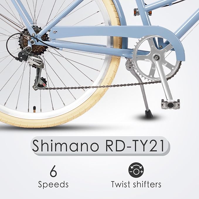 • 🚴‍♀️【Women-Centric Ergonomic Design】Crafted for female proportions: A low-step high-carbon steel frame enables easy mounting, while the swept-back handlebars promote upright posture (reducing back strain). The brown synthetic leather saddle with shock-absorbing springs combines vintage aesthetics with modern comfort.