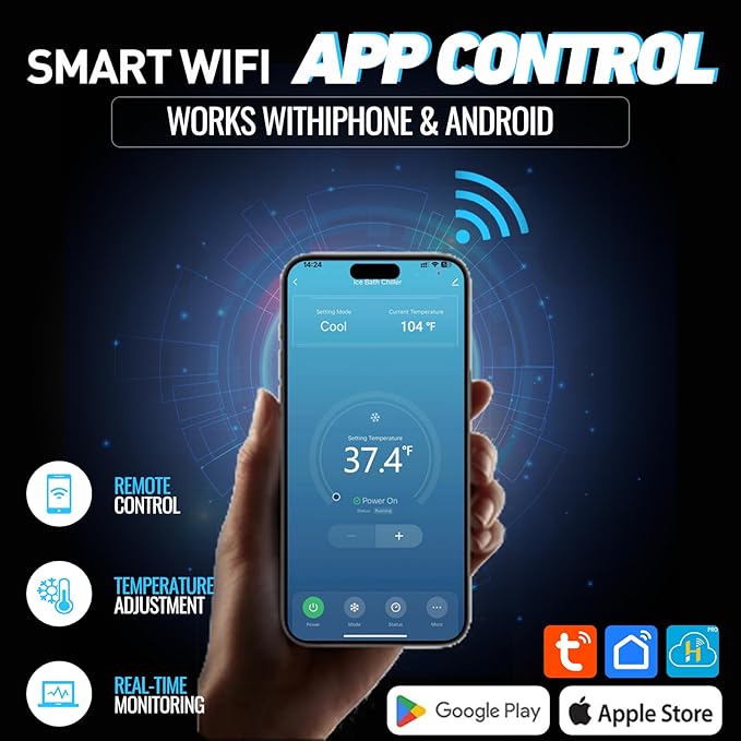 • Remote Adjustment & Quiet Operation: Using built‑in Wi‑Fi, you can adjust your chiller’s temperature from anywhere, ensuring your tub is ready when you are—all while operating below 65 dB for a peaceful recovery environment, indoors or out