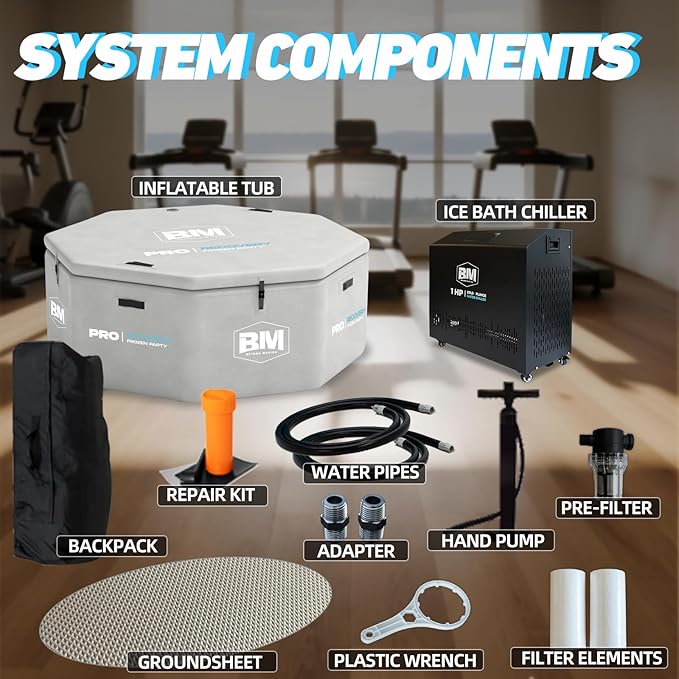 • Complete Recovery System & Accessories: Includes a high‑pressure pump, groundsheet, PTFE tape, piping, seals, wrench, adapter, quick connectors, plus a replaceable filter. Everything you need for fast setup, ongoing maintenance, and a seamless cold‑or‑warm plunge experience