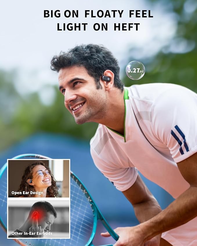 • 60 Hrs PLAYTIME & MULTIFUNCTIONAL BUTTONS - Say goodbye to frequent charging. The CT13 bone conduction headphones offer an impressive 60 hrs playtime, and each earbud can be used continuously for up to 12 hours. In addition, the external LED display allows you to know the remaining power of the charging case in real time, so you will never be without music on the go. With convenient physical buttons, you can adjust the volume, skip tracks, answer calls, and more just by pressing the buttons
