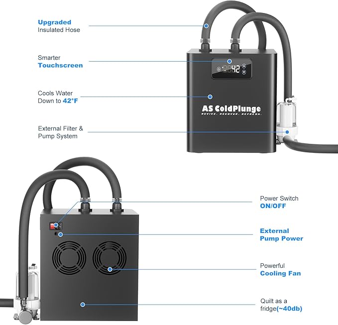 • Cleaner Water with Advanced External Pump & Filter: Water chiller includes a powerful external water pump and 5 inch 20-micron filter system to keep water circulating and crystal clear. The filter removes dirt, hair, and sweat, and the cartridge is easy to replace—ensuring hygienic, low-maintenance cold plunges