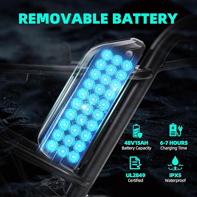 • 【Battery Capacity & Range】:The 48V 15AH lithium battery delivers 37 miles pure-electric range (75 miles pedal-assist) with 2,200+ charge cycles - redefining endurance for adult electric bicycles