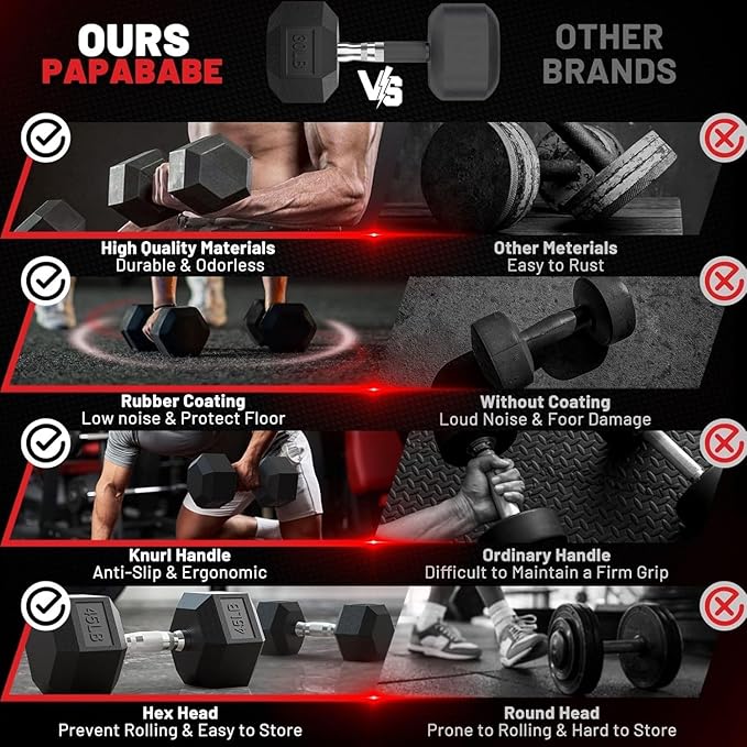 • Durable Construction & Floor Protection: The dumbbells are made of cast iron with chrome-plated handles and a rubber coating. The rubber coating helps resist rust, reduces noise during use, protects floors, and contributes to long-lasting durability.